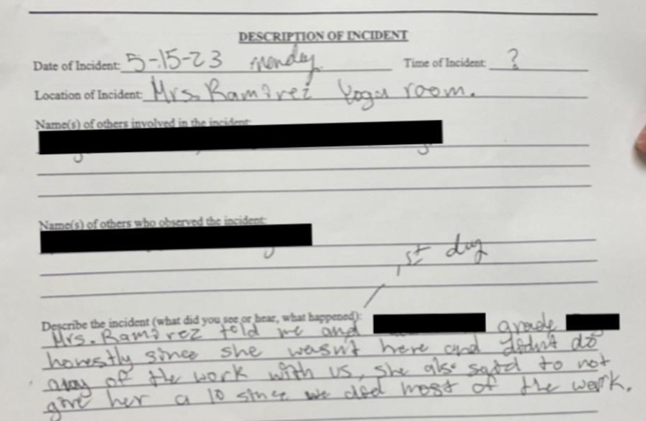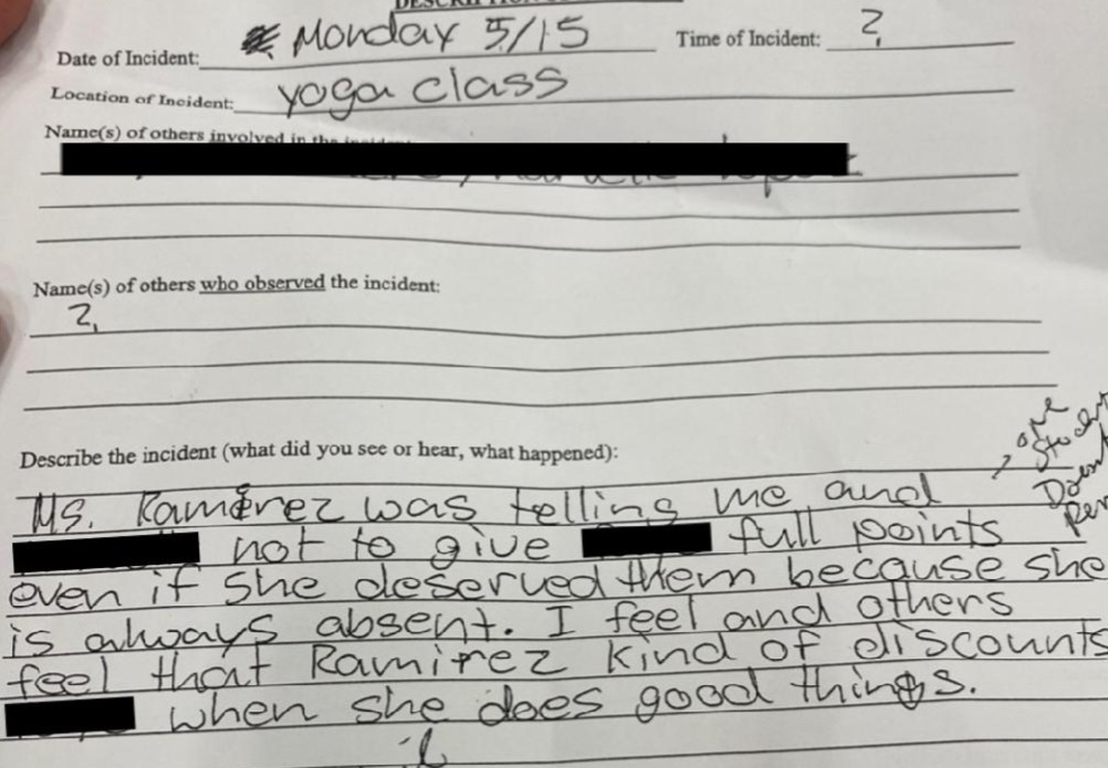 On May 11th, 2023 my daughter was picked up early from yoga class, after Ramirez introduced a group project that was due five days later. The grade for this assignment was to be issued by the fellow group members from one to ten points. The next day my daughter’s group members told her that Ramirez had instructed them to reduce points from her grade because she left early, knowingly and deliberately violating everything she had been told.